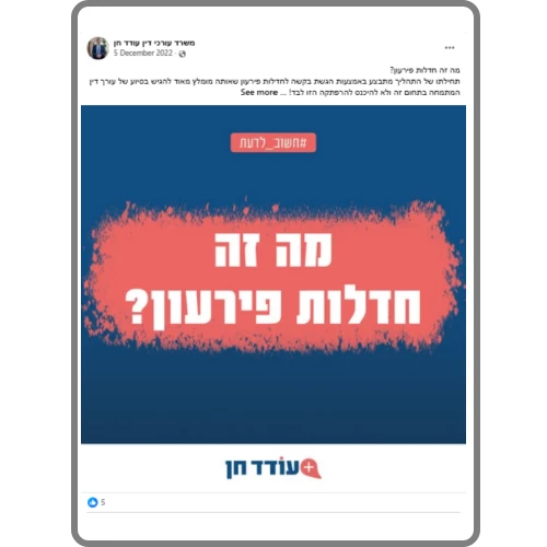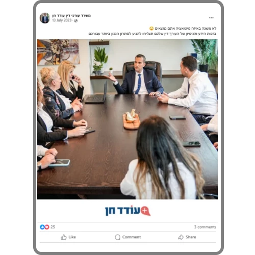 יצירת פוסטים ותכנים המנגישים את הידע המשפטי המורכב של עו"ד עודד חן בשפה ברורה, בגובה העיניים, תוך חיזוק המותג האישי כאוטוריטה בתחום השיקום הכלכלי.