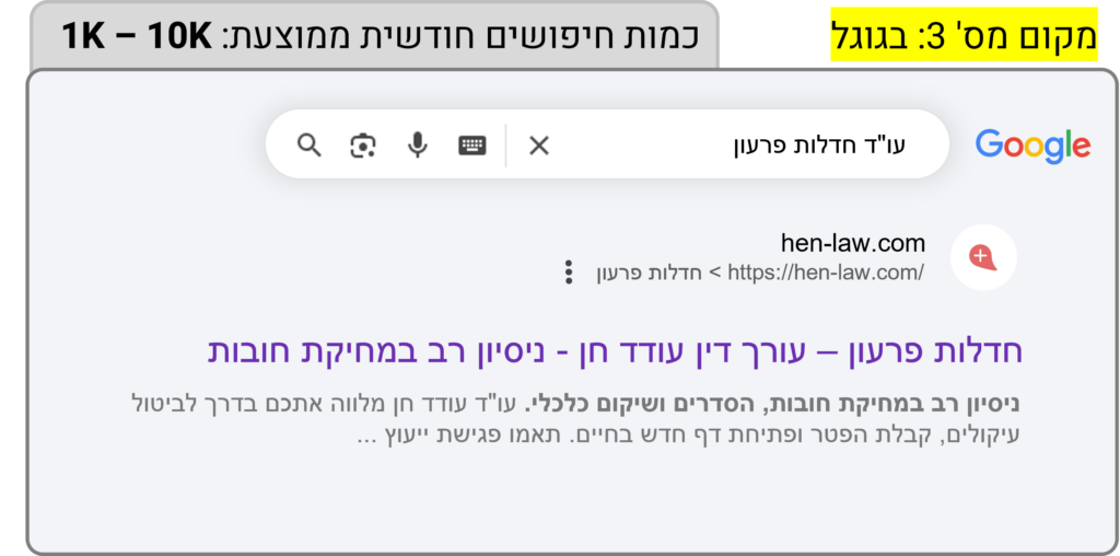 כתיבת תכני עומק מקצועיים לבלוג האתר, המבוססים על מחקר מילות מפתח מדויק. תהליך זה העלה את המשרד לתוצאות הראשונות בחיפושים הרלוונטיים ביותר בתחום חדלות הפירעון, ויצר זרם קבוע של תנועה איכותית (אורגנית) ללא תלות בתקציב פרסום.