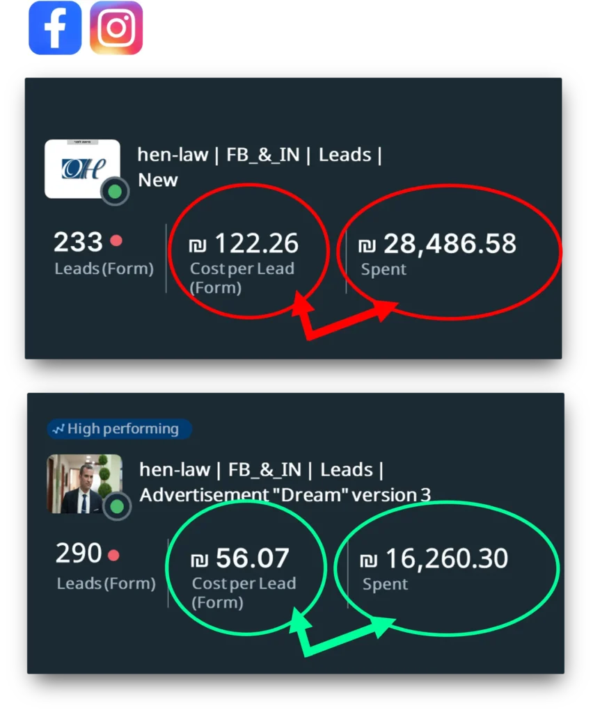 לדוגמא בסושיאל Meta: קראייטיב מדויק יצר קמפיין חזק עם פרסומת חדשה שיצרנו, תרמה רבות להורדת מחיר עלות פר לייד. פחות הוצאות על פרסום הרבה יותר ליידים חמים.